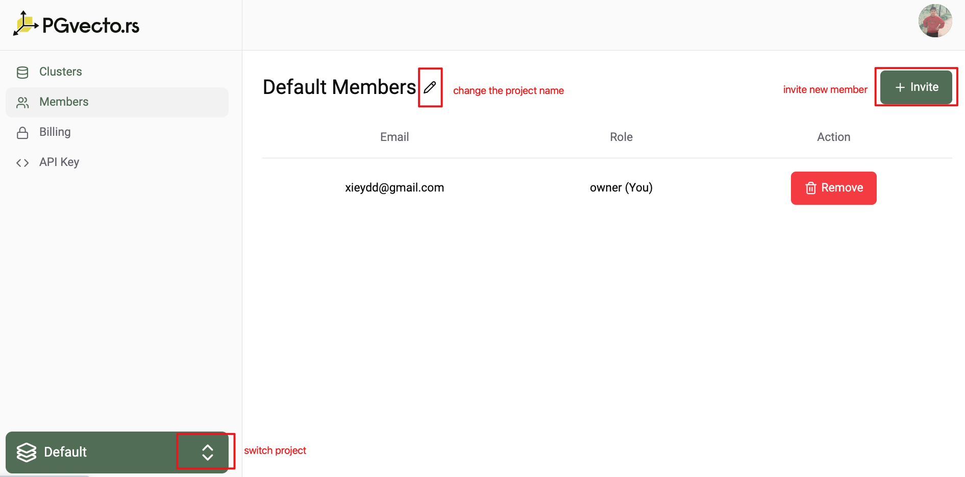 With VectorChord Cloud, everything starts with the project. It is the top-level object in the hierarchy. A project can hold as many Postgres clusters as needed. The maximum number of projects you can create and join is 5.